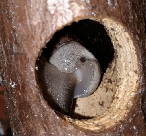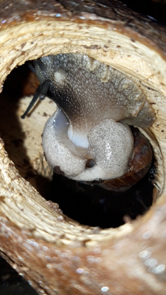 Nach der Paarung hatte sich die andere Schnecke auch kurz an sein Haus gehängt und ist quasi wenige Zentimeter per Anhalter durch sein neues Terrarium gefahren, ob das jetzt einen Einfluss auf den Mantel wie er momentan ist hatte kann ich nicht sagen. Sieht jedenfalls ziemlich krass aus, zum "Glück" sitzt und döst er heute über einem Loch in seinem Stamm, wodurch sein Haus auch wieder hängt und ich von oben endlich mal ein paar gute Fotos machen konnte. Siehe hier: