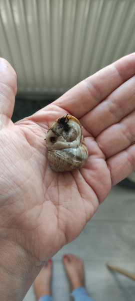 Mir ist gestern vor dem Auto eine Weinbergschnecke aufgefallen. Sie war wahrscheinlich ein blinder Passagier, denn ich war in einem Gebiet in dem es viele von ihnen gibt, aber hier wo ich wohne findet man sie eigentlich nicht.