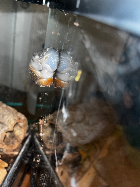 Sie geht derzeit morgens in ihr Loch, aber abends hängt sie fast ausschließlich an der Scheibe. Manchmal frisst sie noch etwas, und vorgestern war sie auch etwas aktiv. Ich dachte schon, jetzt geht es bergauf. Heute Morgen dann wieder hängend an der Scheibe, und es sah so aus, als würde sich der Mantel etwas lösen.
