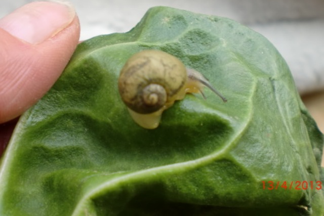 . Futterte sich im Mangold im Bio-Laden durch. Nunja ich muß zugeben, dass ich auch die Blätter genau angeschaut habe, weil mir die vielen Löcher und vor allem die frische Schneckenkacke auffielen.Großartig bestimmen brauchen wir hier wohl nicht, denn ich hatte gleich die Vermutung es könnte eine Grunze sein. Oder doch nicht? Komischerweise dachte ich immer, oha, eine Schnecke die Grunzen kann. Ist ja süß. Das aber erst seit drei Tagen und schwupp die wupp ist sie da.