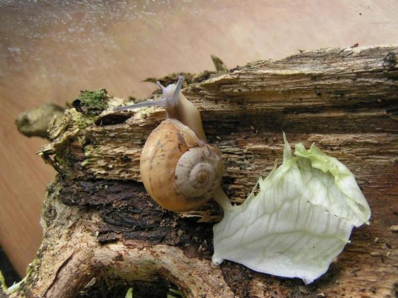 Daheim habe ich sie in einem kleinen Plastik-Transporter für Kleintiere (mit luftdurchlässigem Deckel) untergebracht. Zuerst habe ich nur Erde, Salat und Katzenfutter hineingestellt. Das Katzenfutter nahm sie gern, den Endiviensalat verschmähte sie aber. "Humphrey" blieb von da an bei uns in der Küche. Die Box habe ich immer wieder mit dem Wassersprüher benebelt. Sehr bald fand ich heraus, dass Humphrey verrückt ist nach Eisbergsalat (man konnte richtig zugucken, wie er riesige Löcher hineinfraß) und (haltet Euch fest!) nach Hipp Babygläschen mit Fleischzubereitung (Huhn). Kaum war das an die Plastikwand geschmiert, kam er auch schon angefetzt und fraß sich durch (echt war!). Dann stieß ich auf diese Seite (wollte mehr darüber wissen, was er denn nun eigentlich braucht.). Ich hielt ihn bis dahin für einen stinknormale Gartenbänderschnecke. Doch dann las ich hier von einer "Salatfundschnecke" aus Spanien, die ich auch für eine Schnirkelschnecke gehalten hätte... Doch das war dann wohl eine mediterrane Heideschnecke oder so... Jedenfalls sollte sie lieber nicht hier ausgewildert werden um eine Vermischung der Arten zu vermeiden. Nach dem ich also hier alles nachgelesen habe, was Humphrey wohl so braucht, besorgte ich ihm eine Sepiaschale (denn Kalk hatte er ja nun seit mindestens 2-3 Wochen lang nicht mehr bekommen) und legte ihm verwitterte Wurzeln, Moos und Steine mit Algen dran in seine Box. Er war ganz aus dem Häuschen vor Freude und rührt seitdem keinen Salat und auch kein Babygläschen mehr an! Den ersten Tag saß er fast ständig an der Sepiaschale, nun nur noch gelegentlich. Aber: Heute ist er schon zum zweiten Mal vom Deckel geplumpst. Das erste Mal (vor einer Woche) brach er sich ein Eckchen von der Öffnung ab. Ich hoffte damals, mit der Sepiaschale gelingt ihm die Reparatur selbst. Doch als ich ihn mir nach dem heutigen Sturz ansah stellte ich fest, dass der Außenrand der Häuschenöffnung dünn wie Papier ist. Außerdem ist es wieder an der gleichen Stelle kaputt gegengen, ich trau mich kaum, ihn anzufassen. Seit er bei mir ist, ist er fast auf das Doppelte gewachsen, aber eben alles total dünnhäutig. Wahrscheinlich habe ich alles falsch gemacht!