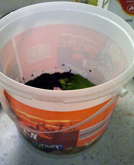 Die Dose ist ziemlich hoch (in Ralation zu den kleinen Kerl)- hab so ca. 3-4 cm erde rein, ein alten kontaktlinsenbehälter als wasserbecken (mit ein paar tröpchen wasser drin und einem stein), das Sepiateil, Gurke, Tomate und Karotte, Eine Kastanie und ein rundes Stück Ton. Die Erde hab ich mit Wasser so von der hand weg ein bissl feucht angespritzt.
