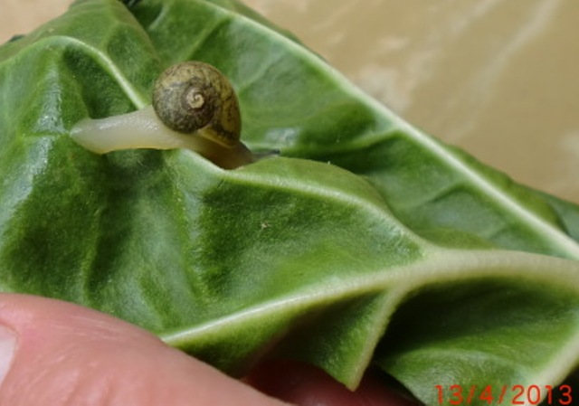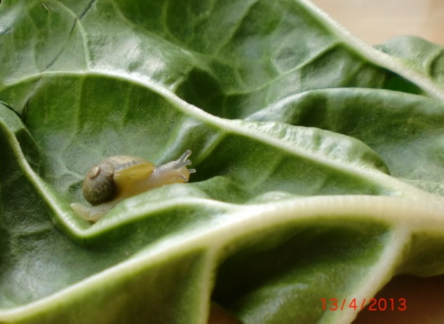 . Futterte sich im Mangold im Bio-Laden durch. Nunja ich muß zugeben, dass ich auch die Blätter genau angeschaut habe, weil mir die vielen Löcher und vor allem die frische Schneckenkacke auffielen.Großartig bestimmen brauchen wir hier wohl nicht, denn ich hatte gleich die Vermutung es könnte eine Grunze sein. Oder doch nicht? Komischerweise dachte ich immer, oha, eine Schnecke die Grunzen kann. Ist ja süß. Das aber erst seit drei Tagen und schwupp die wupp ist sie da.