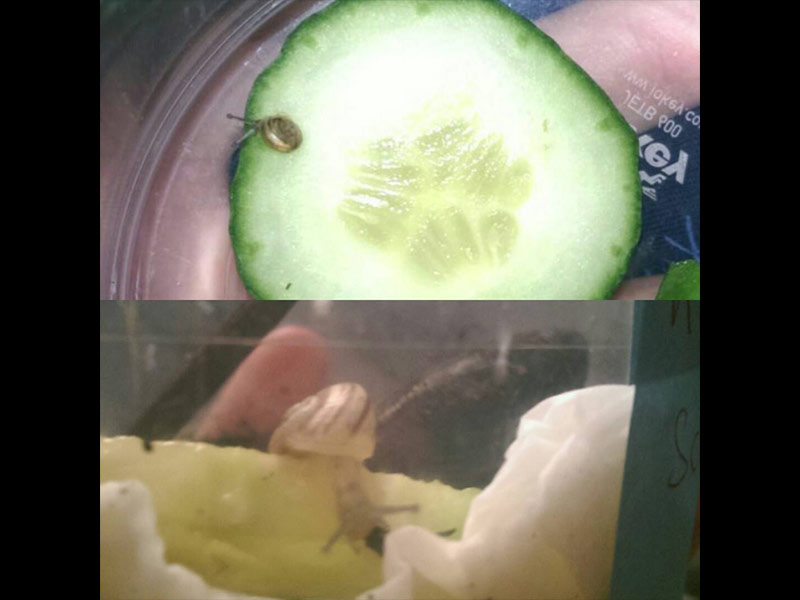 ich habe vor einigen Wochen eine Schnecke in meinem Bio Rucolasalat aus dem Laden gefunden (da war sie noch so klein das sie kaum erkennbar war) und sie behalten, weil es draußen schon so kalt ist.
