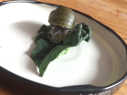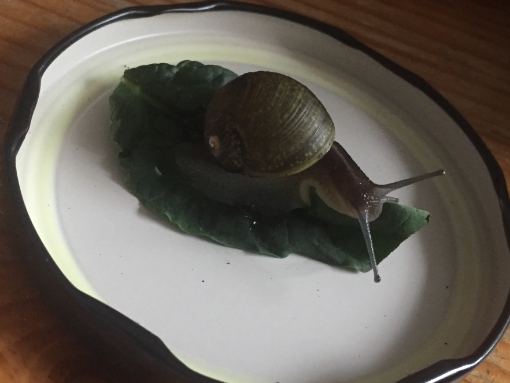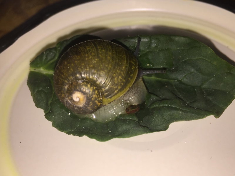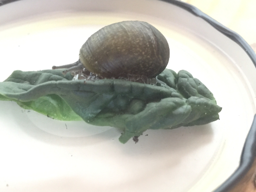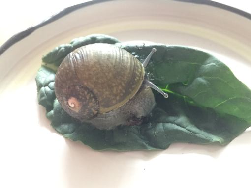 Mein Name ist Jana und ich habe gestern eine lebende Schnecke in meinem Spinatbeutel gefunden. Spinat und Schnecke kommen aus Italien. Ich habe die Schnecke erst einmal vorsorglich aus meinem Essen gerettet, ihr etwas Salat und ein Stück Tomate zugeschoben und sie in ein großes Glas mit etwas feuchter Blumenerde gesetzt.