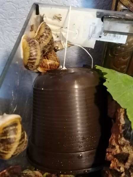 also die Erde sollte gut feucht, aber nicht patschnass sein, drück sie an, sonst kann sie nicht drüberschleimen wenn die Erde locker ist. Nicht viel sprühen, höchstens bisschen an die Scheiben, aber nicht täglich. Lieber das Futter gut feucht machen, wenn die Luftfeuchtigkeit nämlich zu hoch ist, vertragen das die Schnecken nicht, lieber zu trocken als zu feucht. Wenn sie eine kleine Badeschale hat, kann sie Feuchtigkeit aufnehmen wann und wieviel sie will.