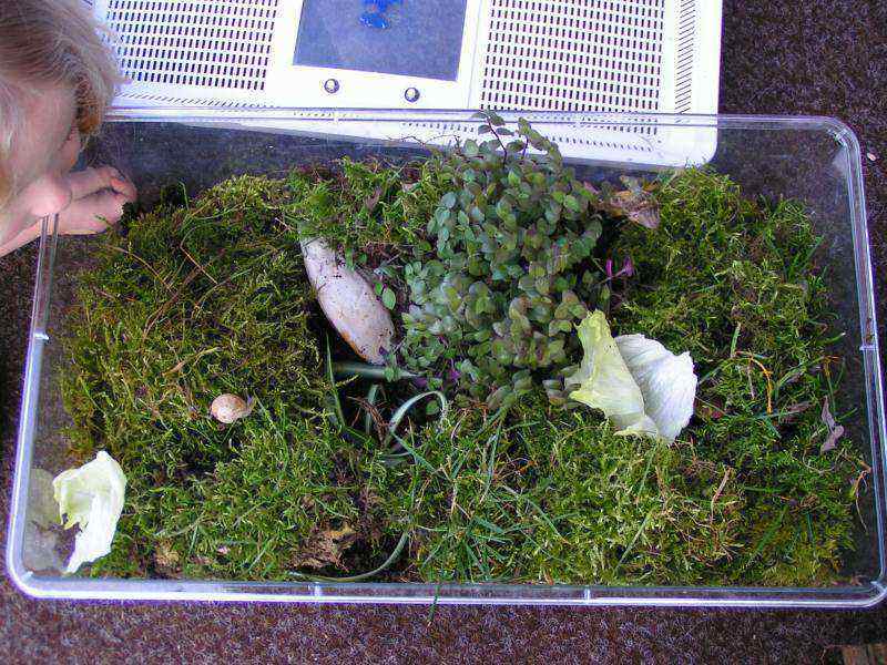 Daheim habe ich sie in einem kleinen Plastik-Transporter für Kleintiere (mit luftdurchlässigem Deckel) untergebracht. Zuerst habe ich nur Erde, Salat und Katzenfutter hineingestellt. Das Katzenfutter nahm sie gern, den Endiviensalat verschmähte sie aber. "Humphrey" blieb von da an bei uns in der Küche. Die Box habe ich immer wieder mit dem Wassersprüher benebelt. Sehr bald fand ich heraus, dass Humphrey verrückt ist nach Eisbergsalat (man konnte richtig zugucken, wie er riesige Löcher hineinfraß) und (haltet Euch fest!) nach Hipp Babygläschen mit Fleischzubereitung (Huhn). Kaum war das an die Plastikwand geschmiert, kam er auch schon angefetzt und fraß sich durch (echt war!). Dann stieß ich auf diese Seite (wollte mehr darüber wissen, was er denn nun eigentlich braucht.). Ich hielt ihn bis dahin für einen stinknormale Gartenbänderschnecke. Doch dann las ich hier von einer "Salatfundschnecke" aus Spanien, die ich auch für eine Schnirkelschnecke gehalten hätte... Doch das war dann wohl eine mediterrane Heideschnecke oder so... Jedenfalls sollte sie lieber nicht hier ausgewildert werden um eine Vermischung der Arten zu vermeiden. Nach dem ich also hier alles nachgelesen habe, was Humphrey wohl so braucht, besorgte ich ihm eine Sepiaschale (denn Kalk hatte er ja nun seit mindestens 2-3 Wochen lang nicht mehr bekommen) und legte ihm verwitterte Wurzeln, Moos und Steine mit Algen dran in seine Box. Er war ganz aus dem Häuschen vor Freude und rührt seitdem keinen Salat und auch kein Babygläschen mehr an! Den ersten Tag saß er fast ständig an der Sepiaschale, nun nur noch gelegentlich. Aber: Heute ist er schon zum zweiten Mal vom Deckel geplumpst. Das erste Mal (vor einer Woche) brach er sich ein Eckchen von der Öffnung ab. Ich hoffte damals, mit der Sepiaschale gelingt ihm die Reparatur selbst. Doch als ich ihn mir nach dem heutigen Sturz ansah stellte ich fest, dass der Außenrand der Häuschenöffnung dünn wie Papier ist. Außerdem ist es wieder an der gleichen Stelle kaputt gegengen, ich trau mich kaum, ihn anzufassen. Seit er bei mir ist, ist er fast auf das Doppelte gewachsen, aber eben alles total dünnhäutig. Wahrscheinlich habe ich alles falsch gemacht!