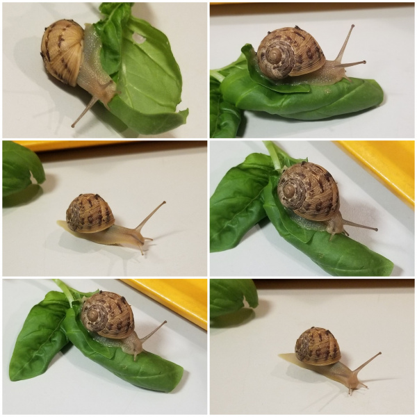 Gestern Abend, hantierend mit schmutzigem Geschirr an der Spüle, sah ich mein Wunderwerk der Natur am Basilikum locker hängend an einem Blätter knabbern.