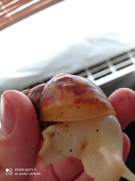 Eben als ich das Terrarium sauber machte und frisches essen frisches Wasser rein machte sah ich unsre größte schnecke momentan 22g und 6 7 cm (die andren sind deutlich kleiner noch)