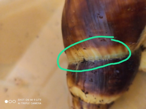 Auf dem Bild, das die Schnecke von vorne zeigt, sieht man noch einen kleinen Wachstumsrand - das ist meistens eine normale Größe, wenn die Schnecke gerade an einem Gelege bastelt. Ab der Geschlechtsreife wachsen sie etwas langsamer.