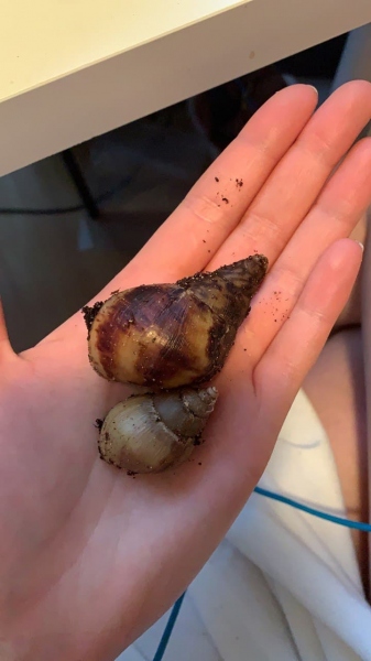 Die größere Schnecke ist eine Reticulata,man sieht deutlich das Wellenmuster auf den ersten Windungen.Die kleinere Schnecke ist vermutlich eine Fulica.
