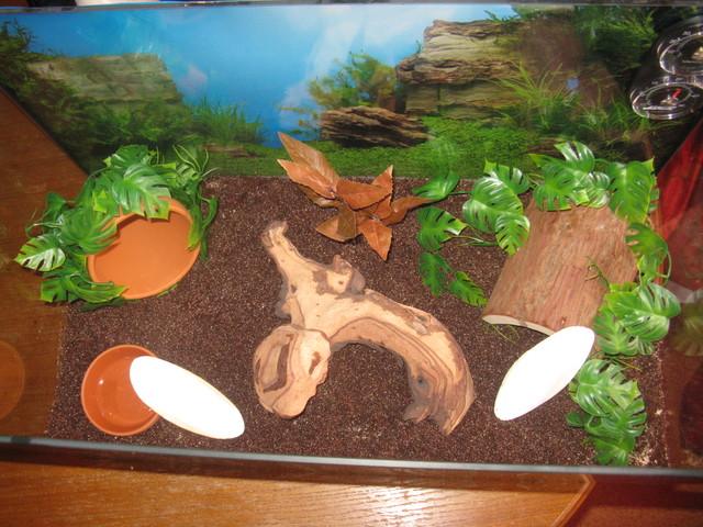 Als Einrichtung hab ich einen kleinen halben Holztunnel, einen kleinen Terakotta Topf, eine Wurzel (da hab ich aber auch Angst, können sie sich da nicht verletzen?), zwei Kunstpflanzen, einen kleinen Futternapf und Sepia natürlich.