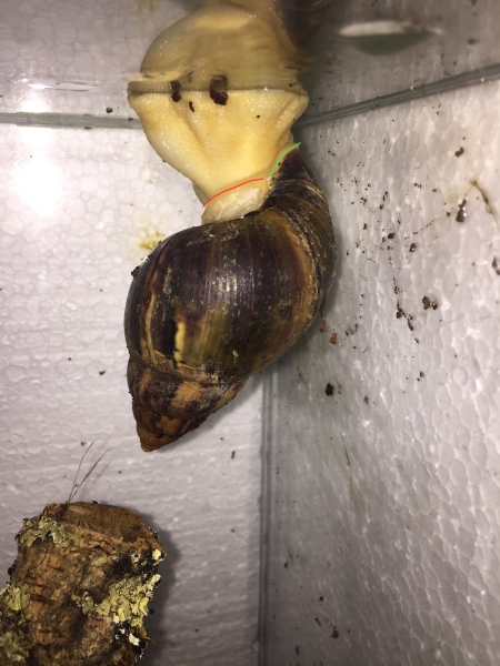 meine White Jade Achatschnecke bereitet mir Sorgen. Vor kurzem habe ich gesehen, wie sie wieder einmal vom oberen Terrariumglas herunterhing und wie sich ein Spalt zwischen ihrem Mantel und dem Gehäuse sichtbar machte. Sie schläft eigentlich fast immer so, da sie sich gern am höchsten Punkt aufhält. Auf den Fotos habe ich die Stelle mit einem roten Strich markiert.