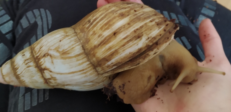 Edit: die oben zu sehenden Tiere sind auch Lissachatina fulica, doch im Farbschlag wildfarben