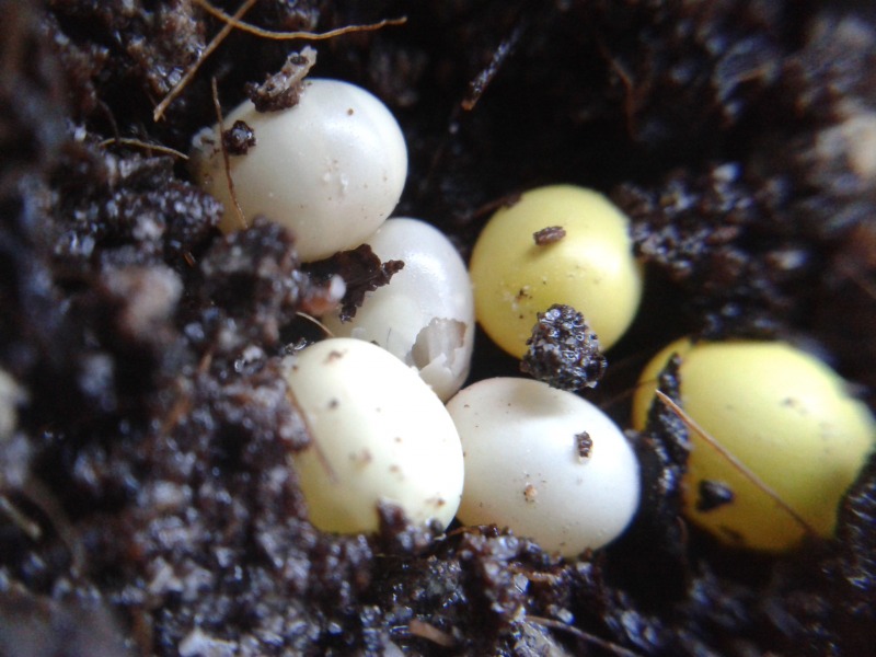 Ich denke dass es an der Frische liegt kann ich relativ sicher ausschließen, weil ich ja jetzt 3 Gelege hatte und das 1. habe ich 3 Tage drin gelassen, bevor ich es rausgeholt habe (=weiße Eier), das zweite habe ich direkt nachdem die Schnecke mit legen fertig war rausgeholt, also sehr frisch (= weiße Eier) und bei der dritten bin ich mir ziemlich sicher dass die Eier beim legen weiß waren (hatte sie beobachtet wie sie sich eingegraben hatte und hab von unten ans Terra geguckt und sie hat die Eier bis auf den Boden abgelegt, waren also gut erkennbar. Herausgeholt habe ich sie allerdings auch erst nach 3 Tagen und war sehr erstaunt, dass sie plötzlich gelb waren als ich sie in der Hand hatte. Deshalb würde ich eher denken sie sind im Laufe der Zeit erst gelb geworden. Aber die Erde wiederum war ja bei allen 3 Schnecken die gleiche...