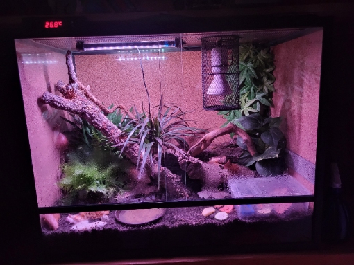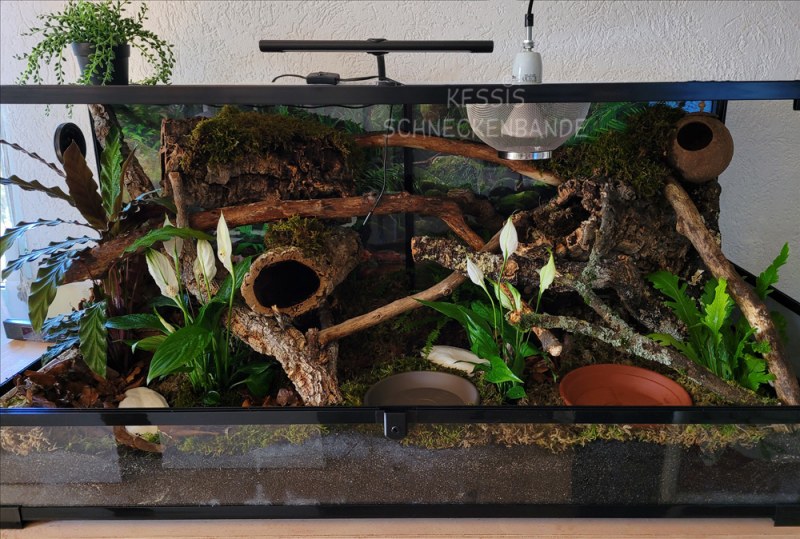 Ich verwende ebenfalls den Thermo Control PRO II mit einer Elstein „Lampe“ mit Schutzkorb. Läuft hier sehr zuverlässig und ich bin zufrieden damit.Direkt unter dem Strahler trocknet die Erde schnell aus, da muss man etwas aufpassen. Ich habe jetzt unterm Strahler Moos, das jeden Tag „baden“ geht. So bleibt die Erde drunter feucht und mit der Luftfeuchtigkeit geht sich so auch gut aus.