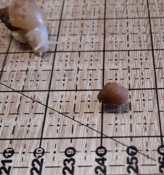 Schildi wächst prima. Sie hat schon fast eine halbe Häuschenumdrehung hingelegt. Ich bin echt glücklich. Auch sieht sie nicht mehr so "verdreht" aus. Das Häuschen sieht aber irgendwie "bauchig" aus. Aber sie ist munter und schneckt durchs Becken. Mal an der Wand, mal an der Decke und manchmal auch eingebudelt. Alles in allem bin ich zufrieden und freu mich total