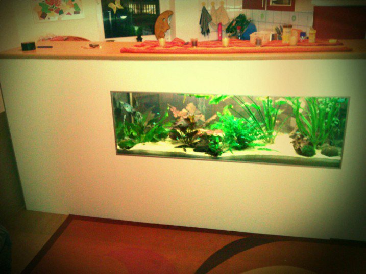 Unser bzw mein Aquarium ist 150x50x50cm gross und ist in eine Selbstgebaute Theke eingelassen die in unserer Amerikanischen Küche als Raumtrenner zwischen Küche und Wohnzimmer dient.