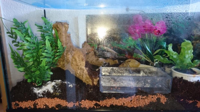 Der Boden ist in beiden Terras aufgequollener Humus mit Kalk und etwas Moos, Tunnel zum Verstecken, Badeschüsseln und Plastikfuttereierbecher in dezentem grün