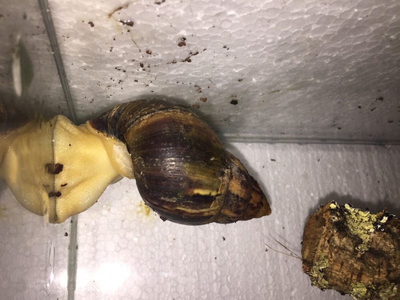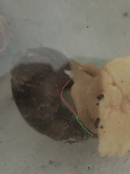meine White Jade Achatschnecke bereitet mir Sorgen. Vor kurzem habe ich gesehen, wie sie wieder einmal vom oberen Terrariumglas herunterhing und wie sich ein Spalt zwischen ihrem Mantel und dem Gehäuse sichtbar machte. Sie schläft eigentlich fast immer so, da sie sich gern am höchsten Punkt aufhält. Auf den Fotos habe ich die Stelle mit einem roten Strich markiert.