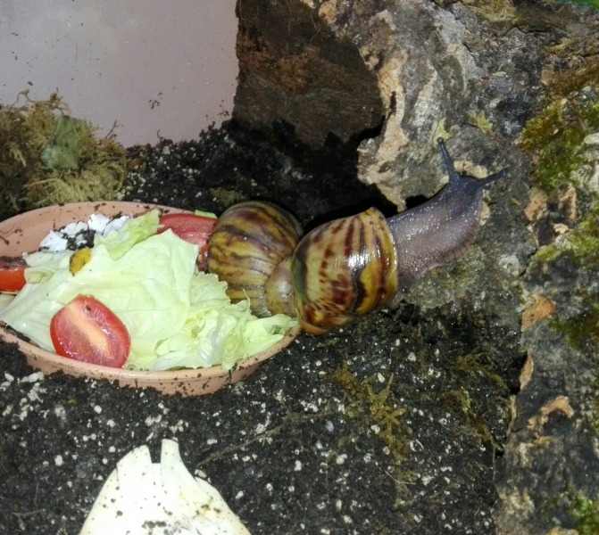 Die dunkle Schnecke benimmt sich normal, frisst gut, ist aktiv sogar sehe aktiv abends, klettert, schleimt rum etc