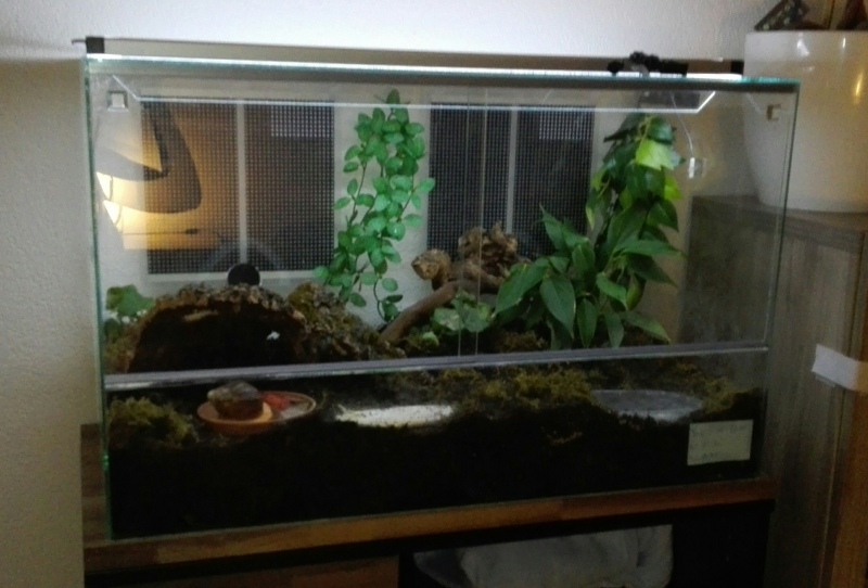 Einrichtung: 2x echter Efeu, 1x Einblatt echt, 2x kunstpflanze hängend, mangovenwurzel (hoff das schreib ich jetzt richtig), Rindenröhre, Moos, Wasserschale plastik, Futterschale aus Plastik (blumentopf untersetzer), Sepiaschale abgekocht