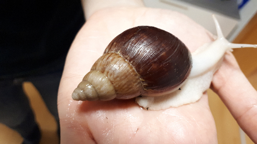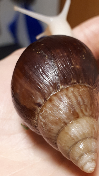 Seit letztem Sonntag bin ich stolze Besitzerin von drei jungen Achatschecken. Laut „Züchterin“ sind es Achatina Fulicas. Ich finde, die Häuschen sehen nicht so gut aus. So hell sollten die Spitzen wohl noch nicht sein, oder? Bei einer Schnecke löst sich sogar eine Schicht bei der ersten Windung.