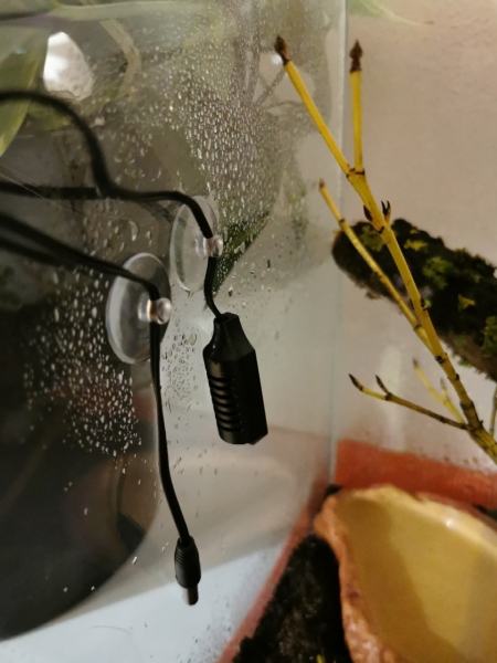 ich habe den Deckel des "großen" Terrariums mittig 2x angebohrt (1x für den Hygrofühler, 1x für den Thermofühler). Die beiden hängen nun einige Zentimeter in die "Schneckenwelt" hinein, es wird sie jedoch nicht stören, denke ich!