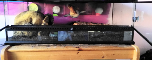 Zur Zeit leben beide zusammen in einem 90 cm langen und 50cm breiten Terrarium. Als Erde habe ich "Jungle Bedding" von der Firma "Lucky Reptile". Diese habe ich aufgekalkt. Die Feuchtigkeit liegt immer zwischen 70% bis 85%. Die Temperatur zwischen 20-21°C. Sie haben zwei große Wassergefäße, einen Birkenast und eine Höhle(aus Kunststoff). Zum Essen bekommen sie bei mir: verschiedene Salate, Gurke, Paprika, Karotte, Apfel, Banane, Pilze, Tomate im Sommer verschiedene Beeren und viele frische Kräuter. Sie haben immer mindestens drei Sepia Schalen zur Verfügung.