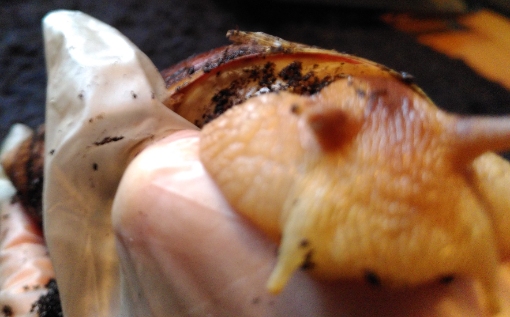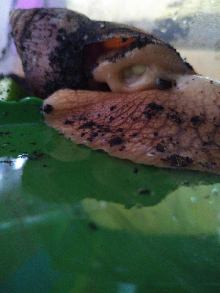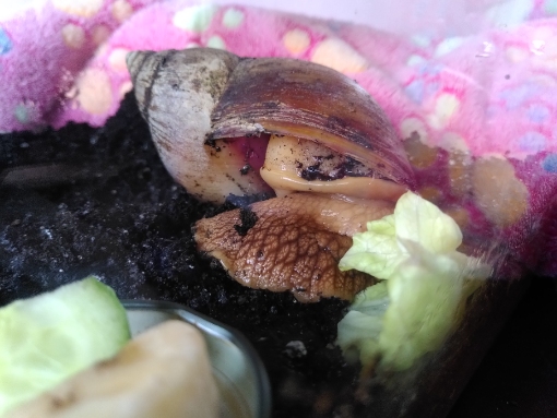 Edit: Ja, ich würde sie auf feuchtem Küchenpapier halten, ganz ohne Erde. Das ist natürlich ungünstig, dass sie gleichzeitig trächtig ist, weil sie dann womöglich keinen richtigen Eiablageort findet. (Und ja, das sind eindeutig Eier, die man in ihrem Atemloch sieht). Ein Mantelvorfall kann mit den Eiern zusammenhängen, wenn es ein besonders großes Gelege ist und die Schnecke schon älter/schwächer. Jedoch können Mantelvorfälle auch ohne Trächtigkeit auftreten. Ganz klar sind die Gründe für diese Vorfälle noch nicht, teilweise werden sie mir häufigem Baden unter dem Wasserhahn in Verbindung gebracht, aber es kann genauso scheinbar aus dem nichts heraus passieren