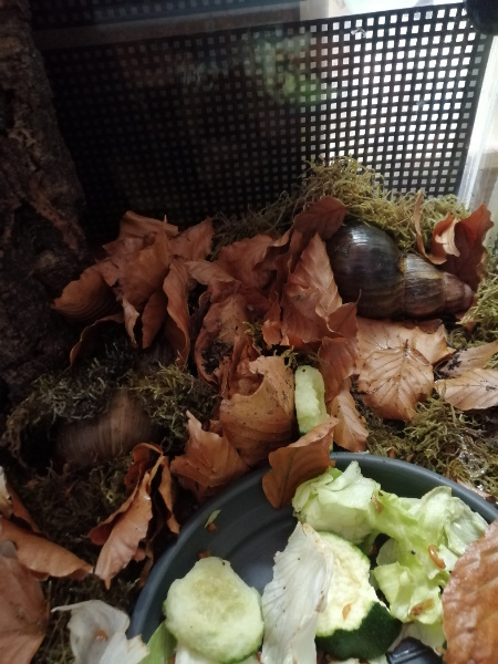 Einmal pro Woche säuber ich und wechsel Moos und Laub. Als Pflanze gebe ich jede Woche frisch einen Lollo Ross/Bianco mit Wurzelballen rein, den ich einpflanze, der hält dann auch die Woche durch. Ich denke, die Schnecken wurden bisher viel mit Gurke gefüttert. Ich gebe jeden Tag sehr gut durchmischt und auf neue Dinge gebe ich ein bisschen Fischflocken, Daphnien bzw. Gammarus, dann haben sie Lust und versuchen auch mal andere Sachen außer Gurke. Sepiaschalen habe ich immer drin und einmal pro Woche gebe ich Kalksuppe, die sie sich hinterkippen.