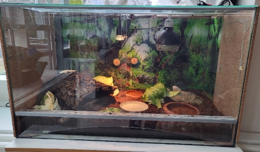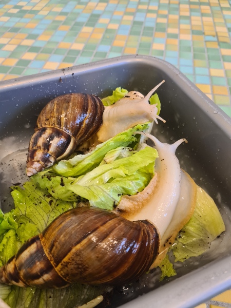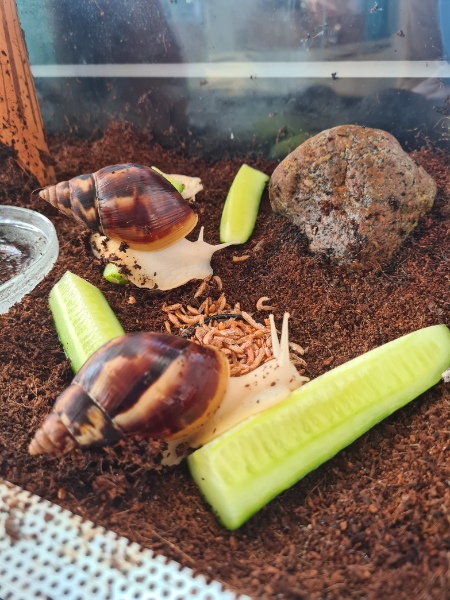 Wir haben mittlerweile auch ein größeres Terra mit Kokoshumus und Kalk gemischt. Gibt es noch etwas, was man den Kleinen gut tun könnte? Wir haben schon Sepiaschalen, getrocknete Krebse und Gemüsereste wie Salat oder Gurken. Einen Korkbaumstamm haben wir auch, wo die beiden gerne reingehen. Ich hänge mal ein aktuelles Foto ran. Wir haben Wasserschüsseln aus Ton - wären diese dann auch zu hart, falls die Schnecken doch mal herunterfallen?