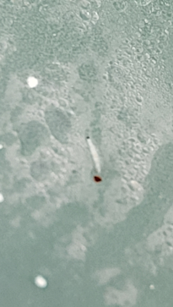 das erste Bild ist ziemlich unscharf; falls der schwarze Kopf zum Rest des Tieres gehört, ist es wahrscheinlich eine Larve (Made). Genaueres kann ich nicht sagen...