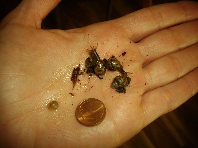 War das von meinen Kleinen anders gewöhnt, daher habe ich mir Sorgen gemacht, dass die sich vielleicht einbuddeln, weil es ihnen nicht gefällt oder irgendwas falsch ist. Das Klima ist jedoch optimal, Leckereien und Sepia genügend vorhanden. Sie kommen zum Fressen abends alle raus und das sieht dann zu putzig aus ... sogar mein Sorgenkind ist glücklich mittendrin und ist noch fit ... hoffe, alle bleiben schön gesund und munter! Ist einfach jetzt schön, die zu beobachten, ohne ne Lupe an der Nase zu haben. Ich stelle fest, dass die Babys Gurke am allerallerliebsten fressen, Tomate und Kartoffel wird gänzlich verschmäht.Zurück zu Anfängerecke (Achatschnecken)