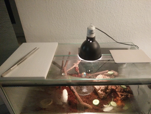 Tagsüber haben wir eine Leuchte mit 50W Lampe auf dem Terra stehen, die schafft es, das Terrarium im Zentrum auf dem Boden 22° und weiter am Rand auf 21° zu bringen.