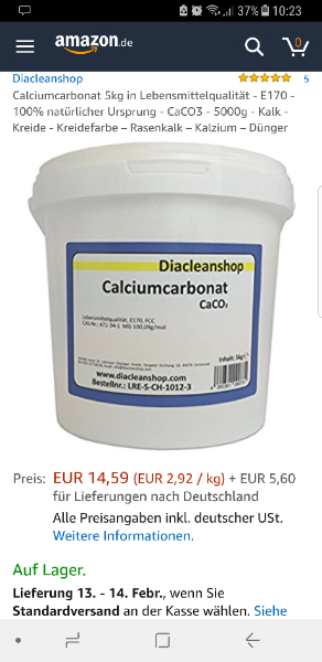 Kalk bekommt man ganz günstig in jedem Gartencenter (meist als Rasenkalk), dann bitte darauf achten dass es kohlensaurer Kalk mit mindestens 90% CaCO3 -Anteil ist, besser mehr.