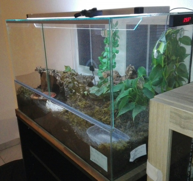 Einrichtung: 2x echter Efeu, 1x Einblatt echt, 2x kunstpflanze hängend, mangovenwurzel (hoff das schreib ich jetzt richtig), Rindenröhre, Moos, Wasserschale plastik, Futterschale aus Plastik (blumentopf untersetzer), Sepiaschale abgekocht