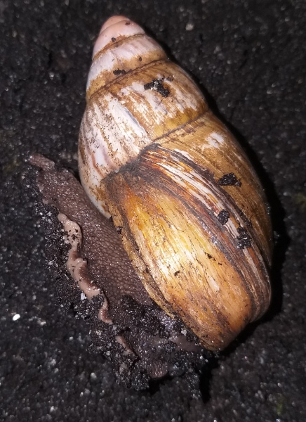 Für mich sieht das nach einer Archachatina-Art aus um sie besser bestimmen zu können brauchen wir noch mehr Fotos von der Columella (dazu schiebst du den Mantel vorsichtig ein bisschen zur Seite, das ist für die Schnecke nicht so schlimm), dem Apex (Gehäuse spitze) und eventuell den Weichkörper: Auch das typische "V" kannst du suchen, das ist am Fußende.