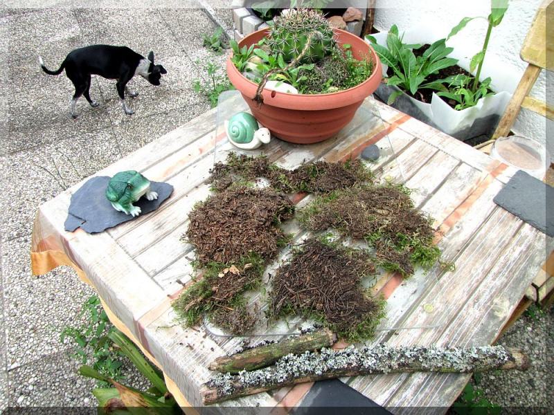 ) und habe unter einem durch Trockenheit und Sturm umgefallenen Baum etwas Erde und Laub gesammelt. Moos wollte ich hier von unserer alten Mauer abpulen und versuchen, es an den feuchten Moorkinewurzeln anzubinden, auf dass es dort hoffentlich weiterwachsen möchte?!Aaaaber: ich las auch von Schädlingen, die man sich über gesammelte Naturalien ins Terra einschleppen kann, allen voran die Schnecken-fressende Glanzschnecke und deren Eier. Um dies zu verhindern, ist backen oder kochen eine gute Gegenmaßnahme. Allerdings ist der Boden nach solch einer Prozedur praktisch tot. Moose überleben das nat. auch nicht.