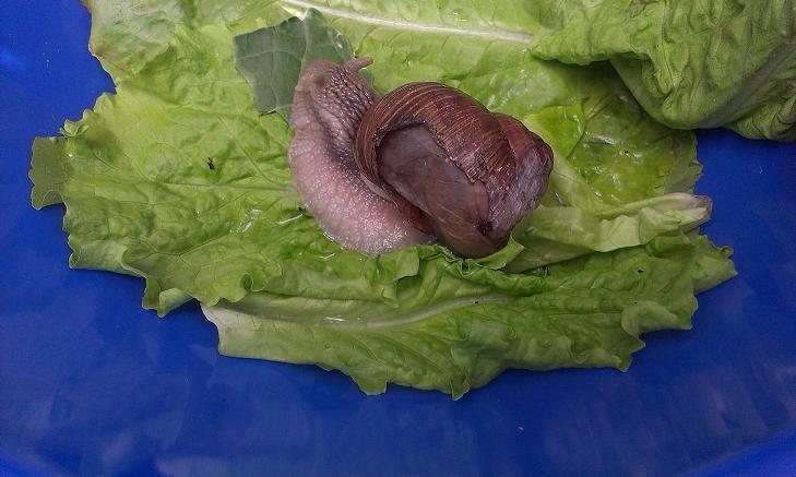 Nach gutem Zureden und vorsichtigem Zurueckschubsen drehte sie sich wieder. Nun habe ich sie in ein Aquarium auf Salatblättern gebettet. Sie frisst, allerdings bewegt sie ich kaum fort. Ich denke sie kann nicht mehr kriechen.