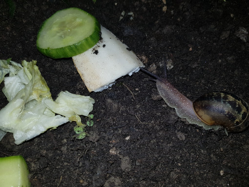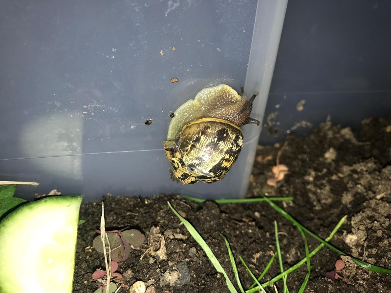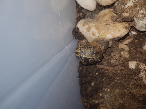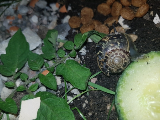 Also, als ich am Donnerstag die Schule verlassen habe, bin ich beim Ausgang einer Schnecke begegnet! Ich hab sie mitgenommen, da ich nicht wollte das jemand drauf tritt. Als ich dann über den Parkplatz zur Busstation gegangen bin, fuhr ein Auto sehr knapp und schnell an mir vorbei, und durch den Wind ist mir die Schnecke runtergefallen. Ich habe mich dann gegen das aussetzen entschieden und sie mit nach Hause genommen (das Haus ist wirklich stark zerstört)