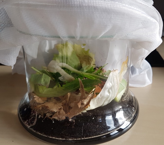 Dazu getrocknetes Laub, Endivie und Puntarellablätter sowie gemörserte Eierschale ohne Haut. Allerdings ist sie, als ich sie darauf gesetzt habe, sofort am Glas hoch gekrochen und hängt nun an dem befeuchteten Wäschenetz, das ich darüber gespannt habe. Liegt das daran, dass die Stücke noch zu groß sind und sie damit nichts anfangen kann? Ich könnte versuchen, Eierschalen zu pulverisieren.. ansonsten habe ich von Sepiaschalen gelesen, aber wo bekomme ich denn nun auf die Schnelle Sepiaschalen im Lockdown?