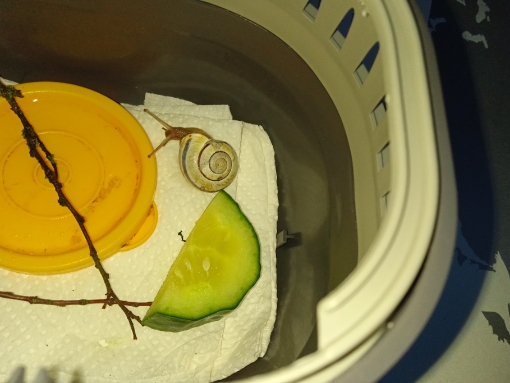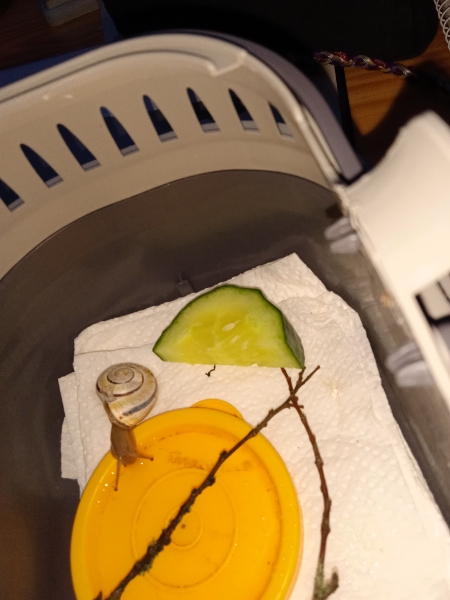 Die Schnecke hat sich über Nacht nicht vom Fleck bewegt. Es sieht so aus als hätte sie ihren Mantel wieder zurück ziehen können. Ich werde sie aber erst wieder zu den anderen setzen wenn ich gesehen habe ob der Mantel auch drin bleibt wenn sie wieder raus kommt.