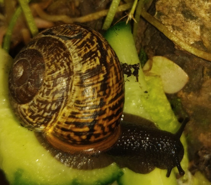 ich habe gestern bei uns im Garten eine kleine Schnecke mit einem Loch im Gehäuse gefunden. Es ist nicht allzu groß (ca. 0,25 x 0,5cm), aber darunter war ihr Körper zu sehen und ihr Häuschen hing ein wenig komisch zur Seite runter. Hinzu kommt, dass ein abgebrochenes Stück des Gehäuses nach innen gedrückt wurde und direkt auf ihrem "Körper" (inneren Organen?) klebt. Ich hoffe man kann das auf den Bild ein bisschen erkennen. Ich wollte die kleine nicht rausnehmen und beim Essen stören, weil sie grade so fröhlich an ihrer Gurke genibbelt hat.