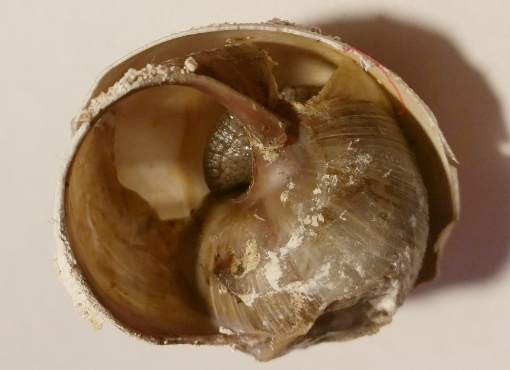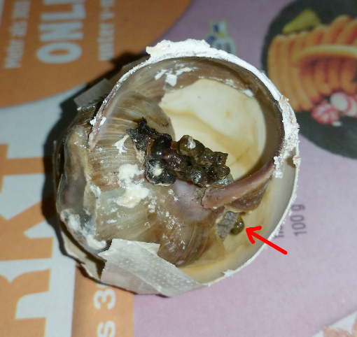 Und das ja ja auch schon mal gut. Das 3. Häufchen war sehr frisch und hing noch an der Schnecke. Ich habs aufm Foto mit nem roten Pfeil markiert - man sieht hier nur ein kleines Wurstende. Ich konnte es mit einer Pinzette entfernen.