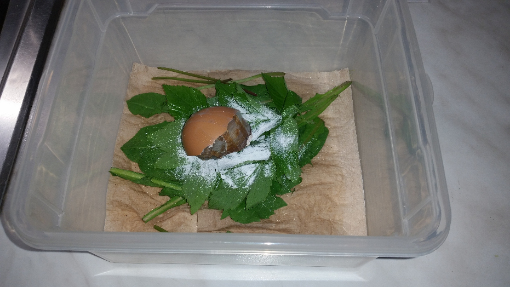 Ich hab jetzt 1 Lage gebleichtes Zewa, darauf 1 Lage ungebleichtes Klopapier, (beides angefeuchtet), darauf Löwenzahn, darauf Kalzium, darauf Giersch, darauf nochmal Kalzium (nochmal minimal angefeuchtet) und darauf die Schnecke. Und darüber noch ein paar Giersch Blätter. Und, wie seit Anfang an schon, einen Pappe Deckel mit immer offenem Guckloch auf der Box und diese Box steht nochmal in einer größeren Papp Schachtel. Hier noch Fotos dazu.