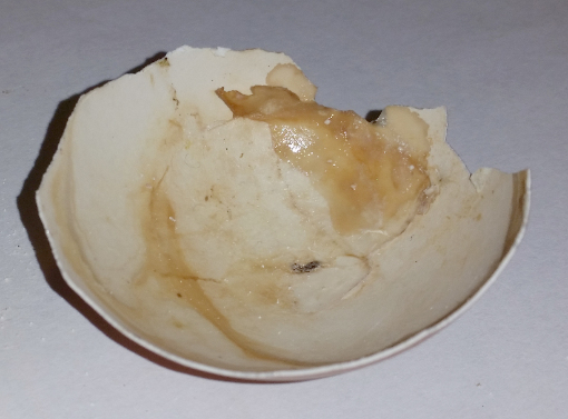 Da hat sie auch schon ordentlich was hingepappt würd ich mal sagen. Dafür, dass da ja sonst nur luftiger Freiraum ist. Sie baut an die Eierschale ran. Keine Ahnung, ob das jetz gut ist oder nicht und keine Ahnung, wie hart das ist. Ich habs nicht berührt. Es sieht jedenfalls sehr stabil aus. Ich habs auf den Fotos am äußeren Rand markiert. Es ist das komplette hellere Dreieck. Geht aber vermutlich noch weiter nach hinten.