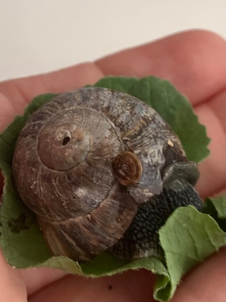 Ich habe die Schnecke gestern in eine Glasbox/-schale gesetzt, die ich mit Erde befüllt und dann mit viel Löwenzahn und Brennnesseln ausgelegt habe. Zudem habe ich Eierschalen abgekocht, dann im Ofen getrocknet und danach gemörsert. Ich befeuchte das Gehege regelmäßig mit Wasserspray und habe einen kleinen Flaschendeckel mit Wasser hineingelegt.