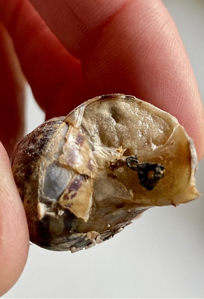Die Schnecke hat sich seither nicht von der Stelle gerührt. Anfangs hat sie viel Kot abgesetzt, den ich entfernt habe. Ich sah auch etwas Flüssigkeit unter ihr. Das kenne ich von stark verletzten Schnecken, die es nicht geschafft haben. Ich war hin und hergerissen, ob ich sie einfrieren oder auf ein Lebenszeichen warten sollte. Nach ein paar Tagen konnte ich sehen, dass sich eine dünne Haut gebildet hatte. Den letzten Rest Kot wollte ich nicht entfernen um die schützende Haut nicht zu beschädigen.