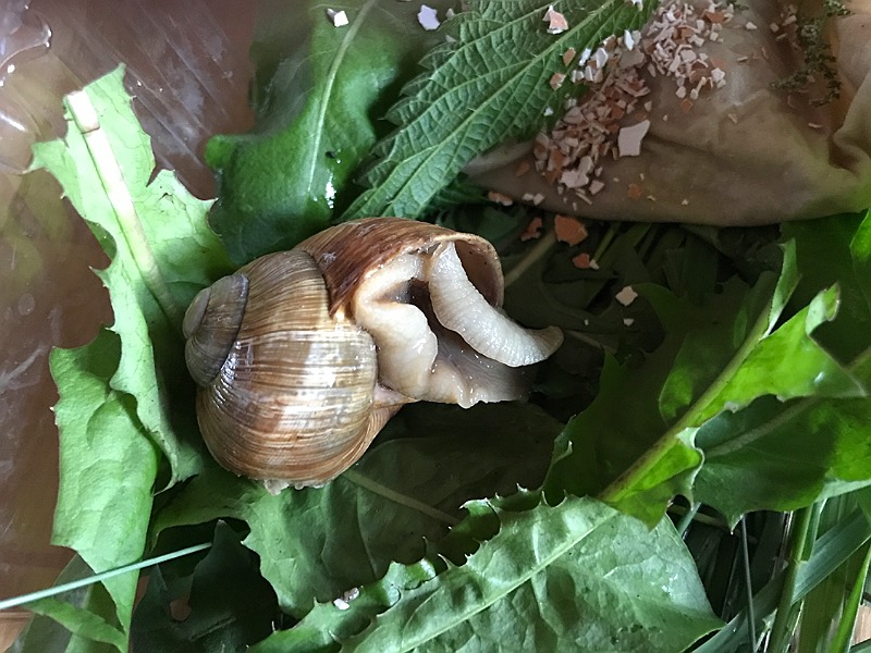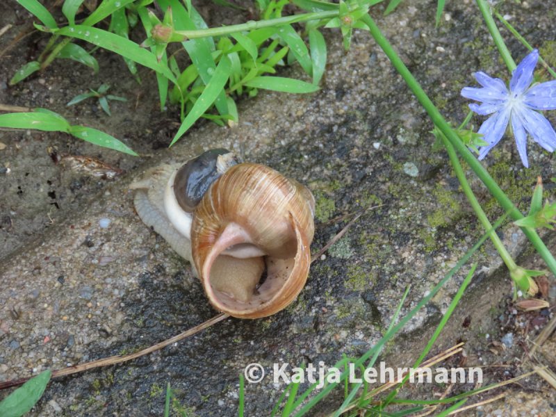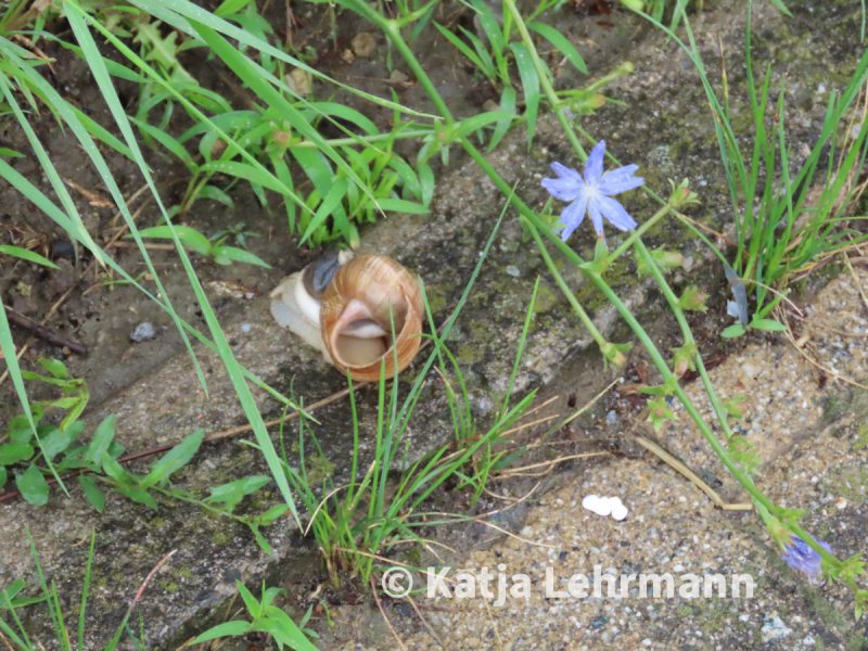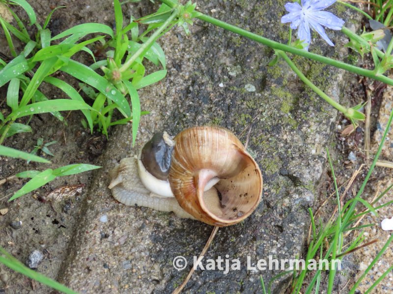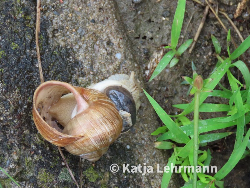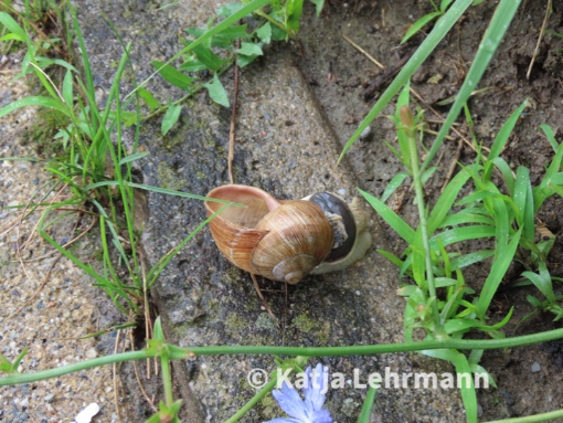 Nach einer Stunde saß die Schnecke noch fast am selben Platz am Rand eines Gehwegs. Ich habe sie dann vorsichtig über eine kleine Gartenmauer ins Gras gelegt, damit sie versteckt war. Jetzt eben (vier Stunden später) habe ich nach ihr geschaut und sie saß fast noch am selben Fleck.
